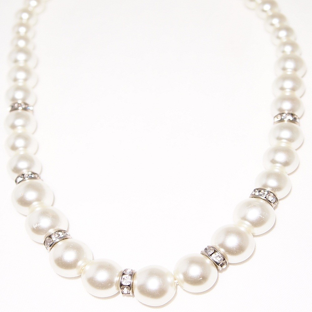 Collier de perles ivoire et strass de 6 à 12 mm, fermoir mousqueton, 48 cm.