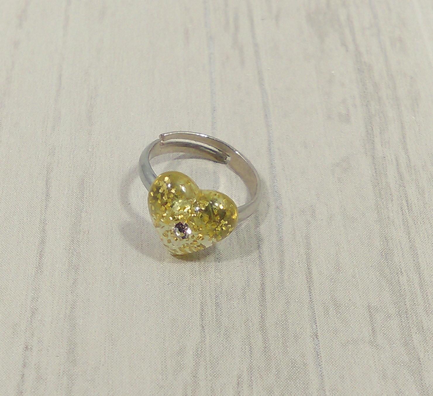 Bague en métal argenté orné d'un coeur doré et d'un strass, réglable de 41 à 50.