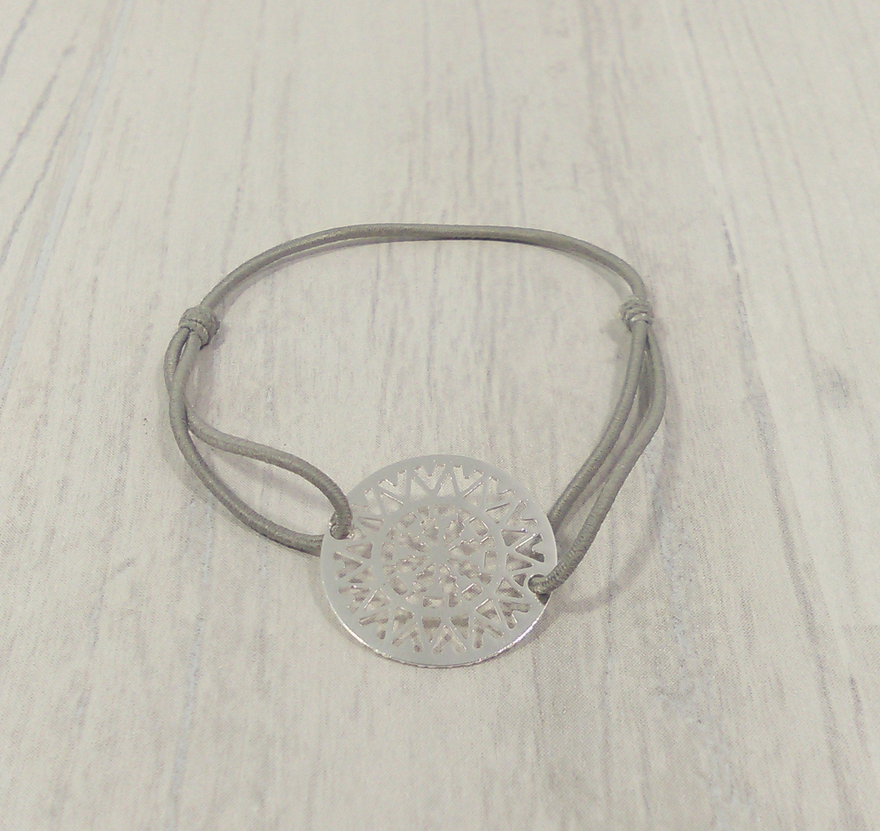 Bracelet rond filigrane en métal argenté, cordon élastique gris clair, ajustable, de 12 à 25 cm.