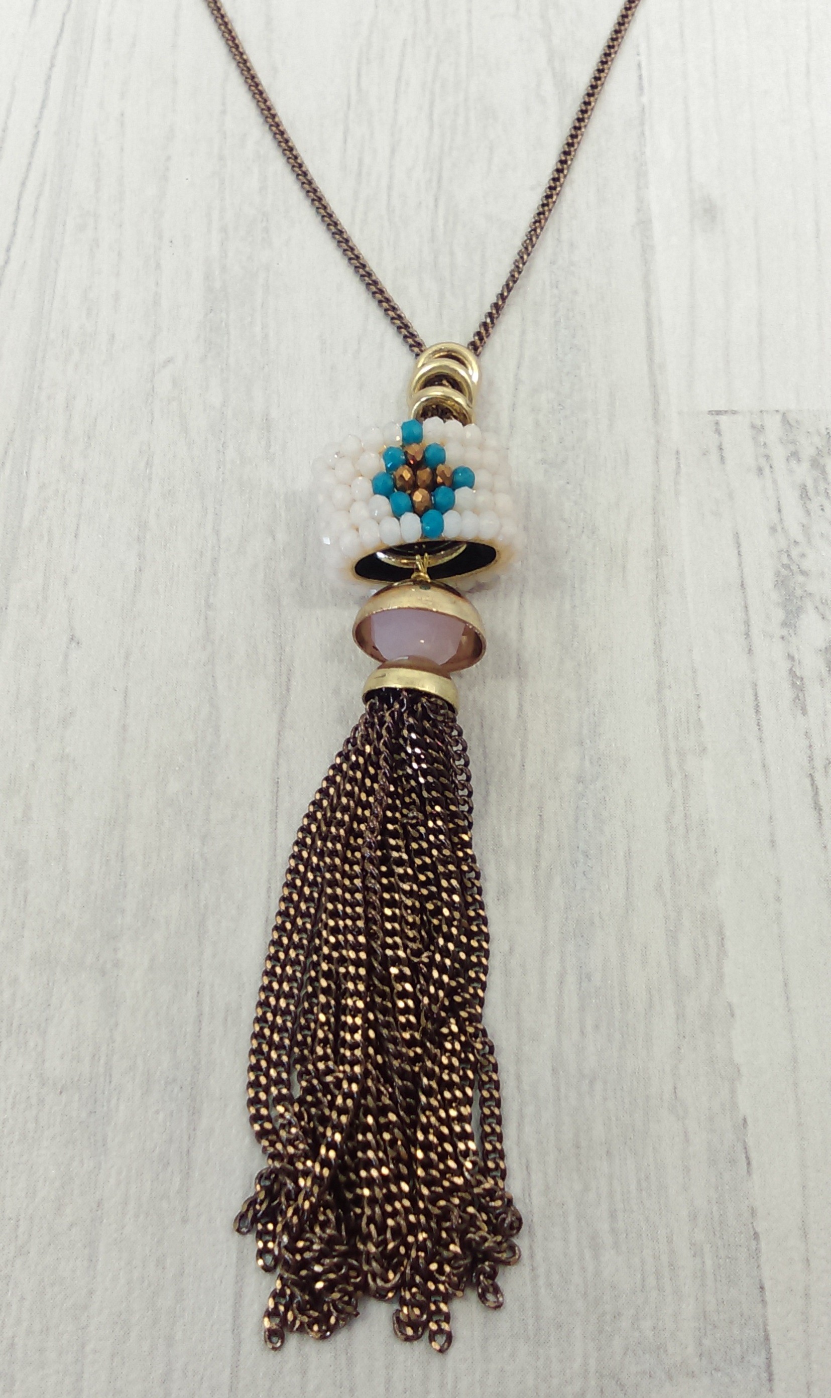 Modernité et élégance pour ce sautoir orné de perles de rocailles fines, de pierres naturelles howlite. Un bijou fantaisie de haute qualité.